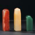 此素章三件套呈红、白、绿三色,其中两件为水洞高山石,一件则为西安绿。两件水洞高山一红一白,红者明快动人,透明处则愈让此章显得可耐玩味;白者上方略做博古,通体白中染黄,有温婉含蓄之致。而唯一的一枚西安绿素章颜色饱满纯净,毫无瑕疵,甚是典雅。