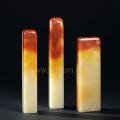 此芙蓉石素章三件套尺寸不一,形态各异,而色皆为红黄白三色,红在上,黄居中,白在下,色彩沉着而过渡自然,极为清雅。