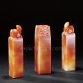 这组作品为施东辉的代表之作,石材选用优质芙蓉石,质地细腻老结,色彩厚重凝润,尤其质感呈现温和的蜡质光泽,致使颜色浓重而不艳俗,深邃、凝 实,不可多得。作者用这三方印章,分别雕刻一枚博古钮章和一对鹅钮,博古饕餮纹狞厉威猛,而古鹅嘴、翅刻绘云雷纹饰,造型神秘夸张,三件相合,抽象而又富 有韵律感的纹饰造型,带给我们独特的审美意蕴。