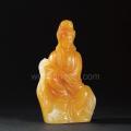 此作品材质为结晶性黄色芙蓉石,质地温凝细腻,晶莹通透,色泽艳丽,通体黄色,色彩饱满犹如蜜蜡,高贵典雅,极为稀少。利用石材由浓转淡之处刻 画山石,白色之处雕刻浮尘、水浪,突出观音整体造型,端丽娴雅,宝相庄严,又不失自然慈和,整个作品刀法流畅,飘逸清新,为传统仙佛造像题材的一件佳作。