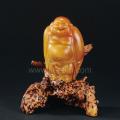这件芙蓉石为金黄色,不甚通透,但温润凝结。笑佛又称布袋和尚,因常背负一只布袋而得名。据传他圆寂前留一偈语:“弥勒真弥勒,化身千百亿,时 时示时人,时人自不识”,因此世间常将布袋和尚视为弥勒菩萨化身。这件作品细节生动,线条流畅,正是作者最为擅长的题材,可谓神完气足。