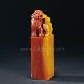 太师少师是传统寓意纹样,其图案为一只狮子怀抱幼狮或者两爪间有一只幼狮。狮是尊贵和威严的象征,“狮”与“师”同音,借谐音太师少师,寓意辈 辈做高官。此石半红半黄,色层分明,作者利用“俏色”法,以平台纽式圆雕母子双狮,母狮为红色,幼师为黄色,双狮紧紧贴合,共戏一球,母狮神态温柔,动态 优雅,而幼狮天真活泼,充满孺慕之情。