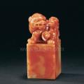 此芙蓉石兽钮方章形制规整,质地晶莹脂润,蜡性较强,富有光泽。细密的朱砂红遍布章体,纯净蕴藉,深浅交错,贵气中不乏雅致,奔放中又见内敛。 印钮作一大一小双瑞兽,大兽四肢矗立,拧身回首,背上驮一小兽,小兽头部微微朝左,仿佛在与大兽嬉戏言语。双兽造型古朴圆润,线条凝练,刀法平稳自然;特 别是大兽四足粗壮简短,配合下部方正的章体,显得尤为端庄,颇有庙堂之气。