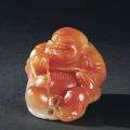 二号矿产于旗山松柏岭矿脉,常包裹于顽石之中,难得大块,纯净者更是十分难得。此石颜色艳红,在二号矿中亦为难得一见的品种。作者依其形状雕刻“托珠 弥勒”。相传五代后梁时期有一僧人,因常背负一只布袋,又称布袋和尚。据传他圆寂前留一偈语:“弥勒真弥勒,化身千百亿,时时示时人,时人自不识”,因此 世间常将布袋和尚视为弥勒菩萨化身。此件“托珠弥勒”亦为布袋和尚形象,大肚能容,开口便笑,令人望之心喜。
