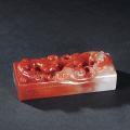 这枚水洞高山石红白二色都很鲜明,其间有桃花过渡,自然明丽。其上雕刻两条螭虎与一枚灵芝,螭虎寄托文采而灵芝寓意吉祥,造型简洁古朴但造型准确生动。此章形制特别,亦可作为镇纸把玩。