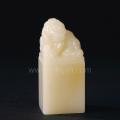 此石为白色汶洋石,章体上带一点淡黄,纯净凝腻,脂润宜人。纽式为平台圆雕古兽纽,姿态慵懒,神情温和,深具含蓄内敛之美。纽台四周浮雕水纹,为整枚印章增添了渐进的层次感。