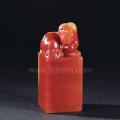 此石材质为水洞高山石,有红黄二色,红如朱砂,黄如蜜蜡,层次分明,鲜艳夺目。纽饰为平台圆雕古兽纽,作者巧以红色作为古兽主体,黄色雕为鬃发肩背,过渡自然。古兽造型饱满,神态温顺,为圆雕古兽的传统风格。