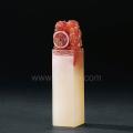 此石为红白双色的水洞高山石,纯净莹澈。水洞高山石产于高山水洞,水洞位于世元洞下方,洞深如井,由上而下,和一般矿洞由浅入深有很大的不同,由于矿洞深入地下水层,故名水洞。红色部分圆雕群螭戏钱纽,玲珑繁复,平台四周浮雕回文,更为整枚印章增添了华丽感。