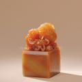 松柏岭石产于旗降山以北的松柏岭,属老岭矿脉,石质坚脆,而佳者十分细嫩。这枚松柏岭石色黄中带红,娇艳夺目,石质纯净,温润凝灵。以平台格局圆雕母子兽钮,古兽造型传统,雕工精美,母兽慈祥温和,幼兽活泼灵动,二者姿态相互呼应,充满孺慕之思,颇堪赏玩。