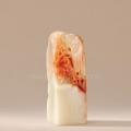 踏雪寻梅梅未开,伫立雪中默等待。张岱的《夜航船》里记载,孟浩然情怀旷达,常冒雪骑驴寻梅,曰:“吾诗思在灞桥风雪中驴背上。”一片文人雅士赏爱 风景苦心作诗的情致。这枚印章以芙蓉石上仅有的一抹红色巧为人物,毛驴和树木枝干,而其余部分则茫茫一片洁白,为覆盖乾坤的冰雪。适当的“留白”流露出国 画的意韵,诗意怏然。