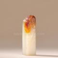 高山石在寿山石中色泽最为丰富,这枚高山石为红黄白三色,主色为白,质地纯净晶莹,以顶部的红色浮雕荷花钮。《乐志•相和曲》曰:“江南可采莲,莲叶何田田,鱼戏莲叶间。”正应此景。