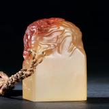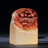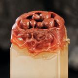 《观石录》曾有云:“肤里莹然,暎烛侧影,若玻璃无有障碍,方二寸,高三寸,重九两。”尺寸如此之大的一块石头,竟然能“暎烛侧影”,不得不令人感叹其透明度之高。而这一枚水洞高山,白色部分晶莹欲滴,几近如是。而《后观石录》中所载“白中有丹砂,铢铢粒粒,透白而出,如白水滤丹砂,水砂分明,粼粼可爱”,又正是此章顶部朱砂色的写照。郭祥忍将这一片朱砂色施以巧雕,以高浮雕松枝托起鸟巢,而镂空其中,巢内圆雕几只雏鸟,萌态可掬。作品为写实风格,将圆雕、浮雕、镂雕、薄意多种手法有机地结合在一起,却丝毫不显突兀,大师手笔不同凡响。