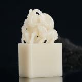 三阳开泰,为中国传统吉祥语。《周易》称正月为泰卦,三阳生于夏,冬去春来,阴消阳长,有吉祥之象。常用称颂岁首或寓意吉祥。阳与羊同音,羊即为阳。羊又儒雅温和,温柔多情,在中国民俗中“吉祥”多被写作“吉羊”,故常作“三羊”为“三阳开泰”之具象,是非常美好吉祥的象征。这枚印章以纯洁无暇的白芙蓉石为材质,以平台圆雕格局雕刻出一大二小三只羊,风格写实,大羊慈和而小羊乖巧,三羊互动,尽显母慈子孝。整枚印章雕工精美,比例合宜,形制规整,观之令人心旷神怡。
