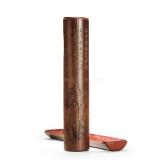 笔盒,专为存放毛笔所用,或随身携带,或收纳于案头,是笔墨纸砚等基本文具的延伸。自古,文人爱竹,苏轼有诗云:“宁可食无肉,不可居无竹。 无肉令人瘦,无竹令人俗。人瘦尚可肥,士俗不可医”。于是在书房、案头,最常能见到竹制文具。这件笔盒,2寸宽一尺长,两扇竹板制成,内涂朱漆。正面竹板上刻有兰花假山灵芝图案,寓意文人高洁志坚,吉祥如意。画面上方留刻有款识“张峰生刀笔题”。竹雕选材极为讲究,需将采伐而来的竹材经数道工序、数年晾晒后挑选不花不霉无虫蛀材质硬朗的材料,方可由经竹人进行雕刻。