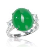 | 拍品规格 | 18K金镶嵌天然翡翠蛋面戒指,翠色浓绿,通透无比,戒圈边镶钻石,造型精美,主石大小约为15.08×13.01×5.56mm,总重量约为8.57克,指环大小约为15。 |