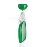 18K白金镶嵌天然翡翠吊坠,两块主石均翠色正阳浓绿,娇艶欲滴,质地水润,配以精致的镶嵌工艺,颗颗钻石葡萄般镶嵌成形,闪闪动人,衬托出佩斯里披肩形的主石色泽温润、晶莹碧透。
