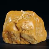 石质少见的银裹金旗降石,颜色明黄艳丽,质地细腻润泽,作者巧借银白色表皮薄意放牧图,其雕工精细,刀法疏朗,画面生动,牧童、水牛、古木相映成趣,一派世外桃源的逍遥之景。作者在摆件的其中一面刻上“牧童归去横牛背,短笛无腔信口吹”,一句优美的诗词将画面描画的淋漓尽致。
