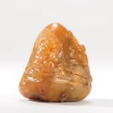 这枚田黄石呈自然尖卵形,下方质地较为凝实,上部更加通灵,色泽自下而上亦从浅黄至橘红,过渡颇有趣味。作者主要以高浮雕与圆雕结合的手法,将其雕刻为《童子献寿》摆件,正面三位童子手捧葫芦、元宝、宝匣等,周围环绕珊瑚树、书卷以及竹篓,庆云缭绕,显得格外热闹喜庆,“长年不羡松筠茂,富贵明年公自有。”“童子献寿”是传统的民俗题材之一,作者将童子们的表情姿态雕刻得尤为细致,天真无邪、笑容可掬,极具吸引力。而相对雕饰华丽的正面,背面则以薄意的手法简练地雕刻出几缕烟云,几枝花树,整件作品充满了华贵的气象。