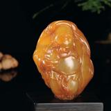 这枚坑头田温细润亮,质地纯净通透,毫无“山石气”,更难地的是体量硕大,乃是坑头田中不可多得的上品。作者将其雕刻为“皆大欢喜”摆件,双脚微微踮起,一只手怀抱稚童,其袍袖垂落服帖,褶皱也显得较为紧凑,另一只手在隐于衣袍之中,袍袖线条仅寥寥数刀,收放有序,挥洒自如,形成对比,更耐人寻味。另外在细节的修饰上,作者也注重形成对比的意象,如弥勒袒露的腹部,寥寥数刀,呈现出光滑无痕的形象,而佩戴的念珠以及背后的斗笠,则刻画细致,极尽繁复之美。弥勒形象是寿山石雕中喜闻乐见的创作题材。弥勒愿大行深,《弥勒菩萨本末大事因缘记》中说:“人常慈心恭敬和顺,调伏诸根,语言谦顺,皆由弥勒慈心训导。”弥勒关注人间现世,不离一般佛教所排斥的“五浊恶世”,将净土安置於人间,充满了对人性的尊重,令人心生亲近。