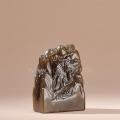 牛角冻出产于坑头洞中,色赭黑,黑中透出红气,通明而有光泽,肌里有水纹,如牛角之纹理,故得名 “牛角冻”。《寿山石考》曰:暑天黛海,日不敢骄。可见牛角冻质色之美。以山子摆件的雕刻风格作自然台深山访友钮式,溪水环绕的山间隐居之处,一位高士信 步漫游,树丛中透出的屋顶或许是深山幽静的古寺。远处高山崇峻,有路蜿蜒相通,云遮雾障,一派隐逸旷达的景象。