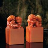 山秀园石 ,为寿山石一种。因出产地近黄巢山脉山秀园村,故名山秀园石。山秀园石虽为新品种,石储存量却极为有限,且品质优劣相差较大。此枚印章材为精品山秀园石,石色红似朝霞欲上时,质地细腻脂润,呈微透明状。印章上端雕太狮少狮纹饰,造型颇为雄健。太狮身形粗壮,圆首阔口,双目生光,炯炯有神,神韵威武。少狮体型稚嫩,趴伏与太狮之上,圆头圆脑,伶俐顽皮。大小狮子喻太师、少师,寓世世代代高官厚禄。