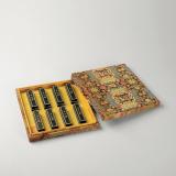 此墨一函八笏,每笏正面书“一品元霜”四字,背书“康熙五年秋九月造”,侧面阴刻“歙吴守默制”,上书“顶烟”二字。吴守默为康熙年间歙县人,与曹素功齐名,墨肆名为“延绿斋”。所出墨品质坚烟细,苍古有韵,但传世极少,在雍正年间已绝迹。吴氏墨艺苍古有韵,所制墨品稀少而精美,如为清初名臣宋荦所制沧浪亭墨、后园六绝句墨,为张榕端制兰樵主人着书墨,为天一阁主人制天一阁藏墨,均为墨中绝品,其中沧浪亭墨为周绍良先生旧藏,后捐故宫博物院。此函“一品元霜”,墨质细腻,原配包装保存完好,弥足珍贵。