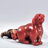 此天犬把件意趣生动,刻工流畅,既有东门派尖刀深刻、剔透灵巧的风格,又有西门圆刀薄意、古朴典雅的韵味。整个作品传统中透着新意,大度不遗细节,细腻不失圆润,古朴而无匠气,实为鉴藏之佳品。 通体半透明, 朱红的肌体布满色泽各异的红色斑点, 点中偶现金砂, 令人爱不释手。