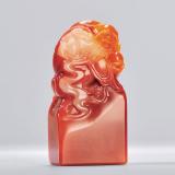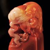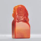 这枚山秀园石质地坚洁凝腻,观之几无瑕疵,尤其是其色泽整体呈蜡烛红色,明艳可人,上方一抹洁白巧色,如微云落于霞光之中,令人浮想联翩。更难能可贵的是,章体裁切方正,形制端方。作者将其雕刻为福禄寿钮章, 印台作自然形, 以洁白巧色雕刻蝙蝠与流云, 老翁手捧寿桃, 须眉飘拂,作者以高妙的技法雕刻老翁的长髯, 线条流畅, 与简洁的衣袍形成强烈的对比, 老翁身后背一斗笠,覆盖布帐,作者将斗笠竹编的质感表现得淋漓尽致,同样与柔软的布帐对比强烈,生动而富有艺术气息。