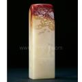 这 枚芙蓉石自上而下为红黄白三色,石质温润洁净,色彩纯正,过渡自然。依自然色彩施以薄意,红色为树木山石,黄色为天际流云,白色的大片空间,仅有一叶孤 舟,翩然远去。布局疏朗,深得国画中“留白”玄妙。整幅薄意取李白诗意“孤帆远影碧空尽,唯见长江天际流”,诗句以阳文行书刻于印章背面。整枚印章充满如 诗如画的韵味,令人爱不释手。