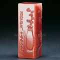 这 枚芙蓉石为朱砂色,底色洁白,肌理中朱砂细点密集成片,竟至一色殷红,殊为夺目。章体为六面方格局,浮雕兰花与灵芝插瓶。雕刻手法不同于寿山石传统薄意技 法中的冲淡写意,而是边缘整齐的工笔风格,颇富装饰意味。石上以阳文小篆题“虚清存正”四字,“虚清”乃是道家修真炼性所崇尚和追求的一种无欲无为的境 界,而“存正”则是虚清中始终保持正道,不离本心之意。画有禅机,值得再三赏玩。