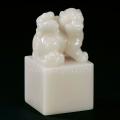 这枚汶洋石通体洁白中泛出淡淡的粉红色,纯净娴雅,温润可人。格局为平台圆雕古兽钮,雕刻母子兽。古兽造型饱满,憨态可掬。母兽神态温驯慈和,幼兽伏于母兽背上,姿态活泼灵动,双兽顾盼呼应,颇为传神。造型虽然简洁,但刀法凝练,细节处一丝不苟,充满传统风格的形式美。