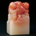 这枚二号矿石为红白双色,白者纯洁晶莹,红者淡雅娇艳,通体纯净无暇,细润凝结。以自然台格局圆雕“童子献寿”钮,以色泽最为浓艳的部分雕做寿桃,两名童子环绕左右,动态活泼,神情欢欣,充满感染力。