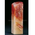 这枚水洞高山石上红下白,色泽深沉浓艳。以薄意手法做山水,巧妙地以山石走势化掉石上的格裂与瑕疵,更辅以树木、藤蔓、流云,一叶扁舟,恍如飞入画图。整件作品布局疏密得当,刀法洗练精微,充满诗情画意。