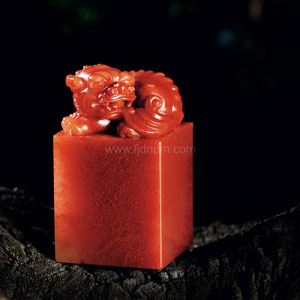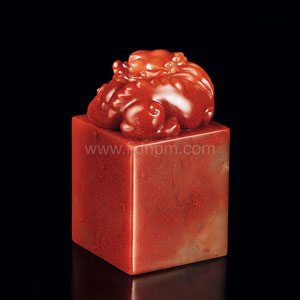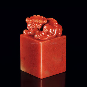 这件水洞高山为方章正材,满朱砂材质,水洞地清净透彻,朱砂艳而不妖,鲜丽动人。且分布上疏密有度,颗粒完满,全无拖拽含糊之感。无论从体量、形制、色彩上看,都有一种端庄大方的稳重感。钮头为制钮名家郭祥忍之手笔,起台平正,刻一卧姿古兽。古兽线条凝练简括、力量感强,开相特征及装饰纹样,均符合传统近当代“东门派”雕刻手法,兽面眉弓劲挺、双目突出,且刻画瞳仁以造成视线感,神气完足,整体的形感亦佳,虽是卧相,威风不减,是印钮中少有的佳作。