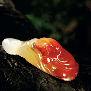 这件水洞高山石所刻之罗汉,材质纯澈,灵秀之极。材质底地清透如水,石色匀净鲜丽,犹如夕阳余晖,濡染淋漓,令人观之心迷神醉;而入手清凉滋润,石形全无尖峭之角,处处圆润适手,使人玩之亦心旷神怡。红俏处被作者取俏刻为睡姿罗汉:罗汉全身具用圆刀雕刻,衣褶线条和缓,面部线条极简。袈裟之下,又有两块红俏未作详细雕刻,仅在外围勾勒大型,呼应整体构图,似乎罗汉自被下屈顶膝盖,甚有生趣。