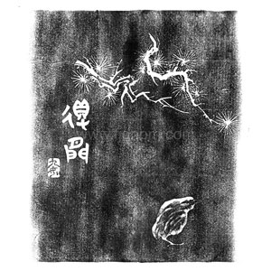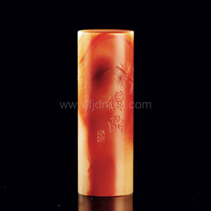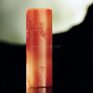 这件作品为芙蓉石材质,丹砂点点,甚为曼妙。作者别出心裁,以阴刻手法,作鹌鹑于松下小憩之题。松下鹌鹑形象,取自八大山人《鹌鹑图》。作者又辅苍松在上,并于章体一侧落“得闲”二字。八大晚年心境澹泊,多不假华饰,大多以简代繁,但无论鸟兽,均表情丰富,情态有趣。此件依八大笔墨而作,亦有此风。整体画面与“得闲”二字呼应,颇可见悠然之雅趣。