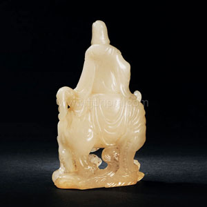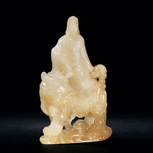 该件作品以荔枝洞石雕刻而成,质地凝澈通灵,表现“观音骑狮”题材。观音右手持念珠,面色端严,神态宁和,从容驭狮,腾云驾雾,颇有一种自在闲适的意味。而身下狮子体态硕壮,驻足回眸间,凛凛顿生风,自有一种威严摄人的气魄。细节表现上,观音的衣袂,狮子的毛髮,都尽量流畅自然、洗练简洁,无丝毫繁缛矫作之气。