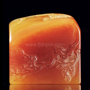 这件作品为高山桃花冻石,章体饱满规整,桃花颗粒分明,层叠错落,沉浮有致,以光试之,犹如佛宝赤珠,颗颗随光影离合,纵跃于石中。整件作品微带橘黄色调,与红色的桃花相互映照点染,有照人之艳光,而无妖娆之时弊,真人间绝色美石也。而雕刻者亦是知音:一面刻逍遥渔父一名,卧眠孤舟,石色丹砂,犹如夕阳余晖,点点落于波光之中。一面则刻桃花一枝,花叠丹砂,仿佛天然佳色沁出桃华,有灼灼之态,诚为雅玩之选。