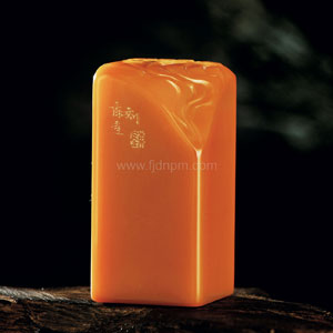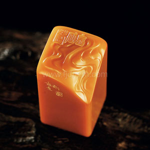 此件作品为汶洋石材质刻就,全章裁切整饬,兼且色泽浓黄,颇有古朴浑厚的气息。质地密聚凝结,蜡质感强。全章并未起台制钮,亦不在章体上多做刻画,而在章坯上方处刻流云纹路。流云辗转流畅,盘旋往复而绝不生硬尖峭,虽用刀不多,但极富层次感。且章顶有一角略带凹陷处,作者亦刻流云一缕,随形袅袅而上,瞬间仿佛山中烟云,自峡谷间升腾而出。玩赏之时,转至此处,顿感手中握玩灵通仙器,而烟云尽从指间拂拂而出,有化须弥于芥子之趣。流云之上,又落篆书“金石寿”三字,更使人生出“时光飞逝,亦不能改金石之乐”的畅怀情味。
