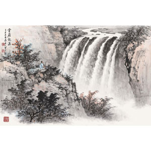 此作据题识可知,为黄君璧 1985 年春季所作,是年黄君璧已八十八岁高龄,故称“米寿老人”。“云岩观瀑”是黄君璧晚年非常喜爱创作的画题之一,虽常有黄君璧同题之作,然而趣味构图却各有特色。此作为浅绛山水,所划一游人坐于悬崖峭壁之上,面对对面奔涌之下,万丈白练垂下,侧耳仿佛能听见迸溅翻腾的轰鸣之声,令人有惊涛骇浪之想。尤其是瀑布水浪之光影变幻,颇得黄君璧画云海闪烁之风格,可谓黄君璧山水画极为鲜明的特色之一。而与汹涌奔腾的瀑布形成鲜明对比的是,老者所坐之悬崖一侧,景致秀美平静,草木蓊郁,又有一树枫红,和绝壁之浅绛颜色遥相呼应,正是元诗所描绘“霜枫红欲尽,涧瀑落长鸣”的景象,云影自在、水浪呼啸,游人以青蓝点染,更是点睛之笔。整件作品气势宏大之余又有文人之典雅庄重韵味,实为黄君璧书画之精品。