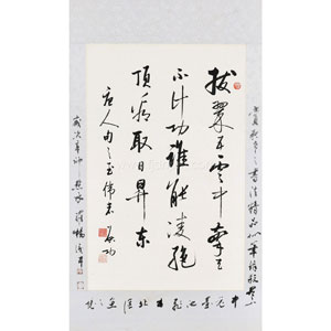 启功的书法饶有特色,被称为“启体”,他的书法韵律优美、意境深远,书法界评论其“不仅是书家之书,更是学者之书、诗人之书。”此作为启功行书唐人丁鹤年的《题天柱山图》:“拔翠五云中,擎天不计功。谁能凌绝顶,看取日升东。”启功自题此为“唐人句之至伟者”,因此在这件书法的用笔上,启功同样以笔法表现了矫健、清劲的线条美感,难怪他的学生罗杨题此作云:“笔锋杀尽山中兔,墨池飞出北溟鱼”。
