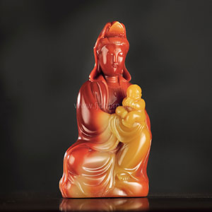 此品色相曼丽,红、黄二色,界色清晰,色彩充盈且毫不含混、黯淡。兼之体裁饱满无损、抚之温厚柔腻,入手沉凝密结之材,在众多芙蓉之中, 无疑可以脱颖而出,使人惊艳。刻为送子观音,观音面目秀美,直鼻小口,面庞圆润,衣纹随形体处理不作镂刻,且手足、发髻等刻画多较为细致、柔美,由于用刀柔和,塑形规整,故无琐碎之弊,带有简致之美,富超然物外之气韵。即便是“送子”这类偏向民俗的题材,观音的面相依旧典雅、大方,不至沦于俚俗之气。