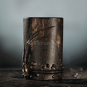 此件为加里曼丹沉水料所致,雕刻为竹节形状,竹叶飞动上行,贴竹节而生,底部则刻竹根。材质保留完好,修光妥帖,光润非常。作者雕刻与塑形偏好,均不似一般竹木雕形式,更偏向石雕类的表述语言。故而全件注重挺括之线条、勒边,造型整体简约大方,颇有一种堂皇之气。